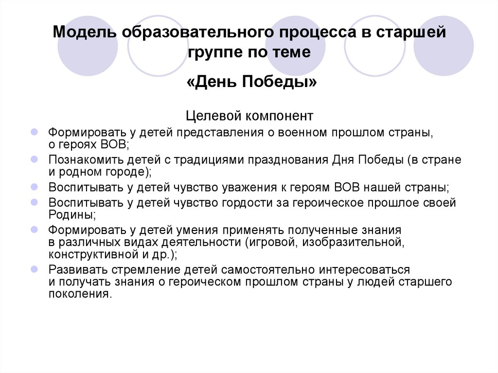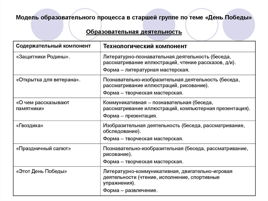 Модель образовательного процесса в старшей группе по теме «День Победы»Образовательная деятельность