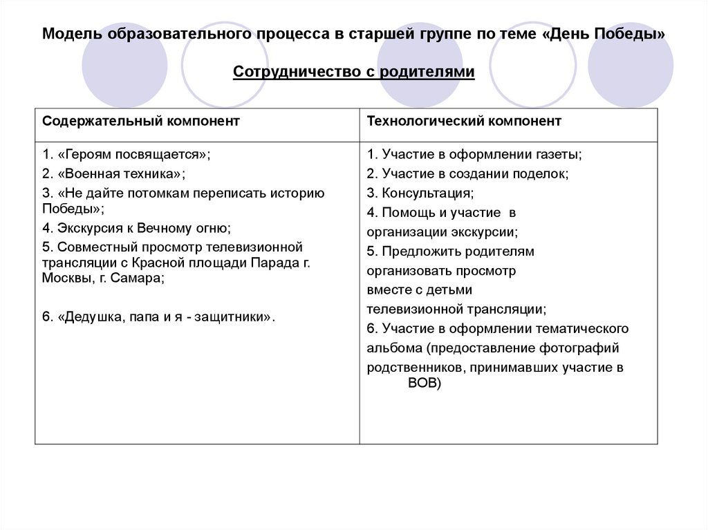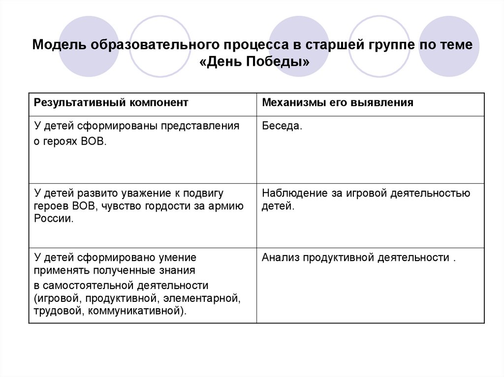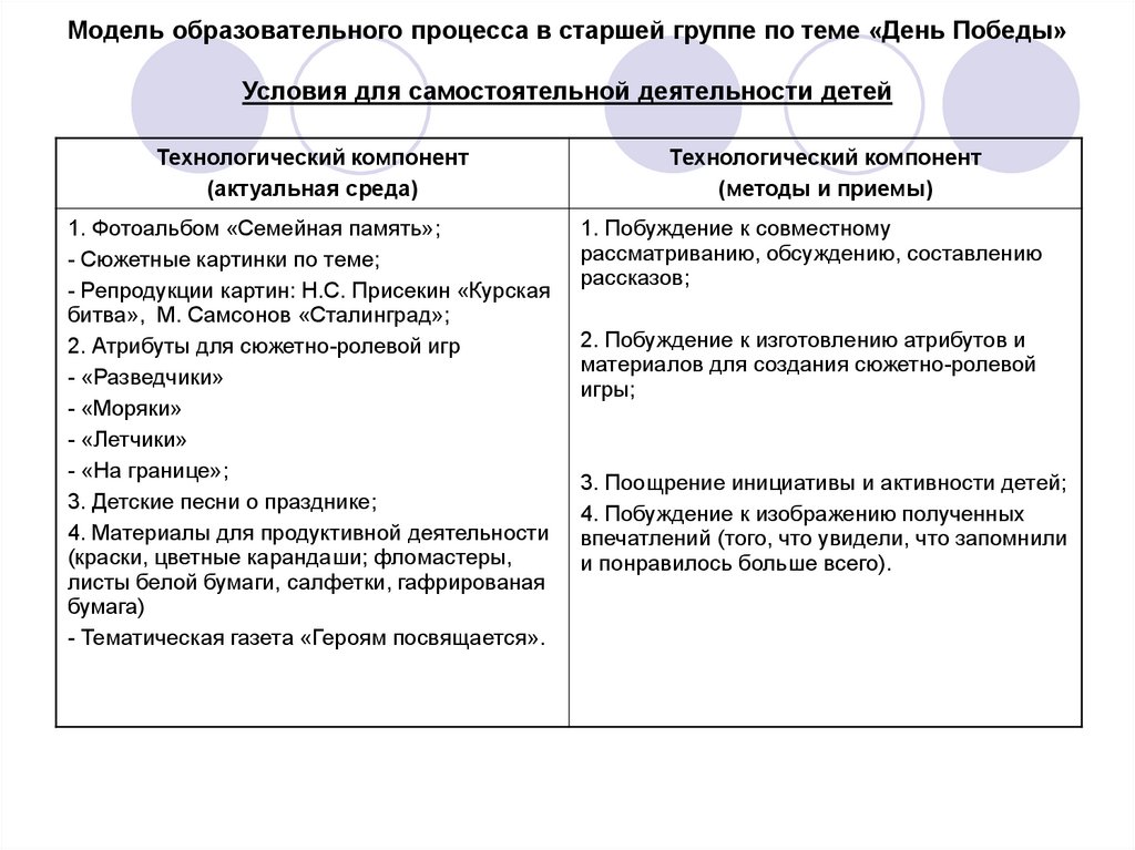Модель образовательного процесса в старшей группе по теме «День Победы»Совместная деятельность воспитателя с детьми в режимных процессах