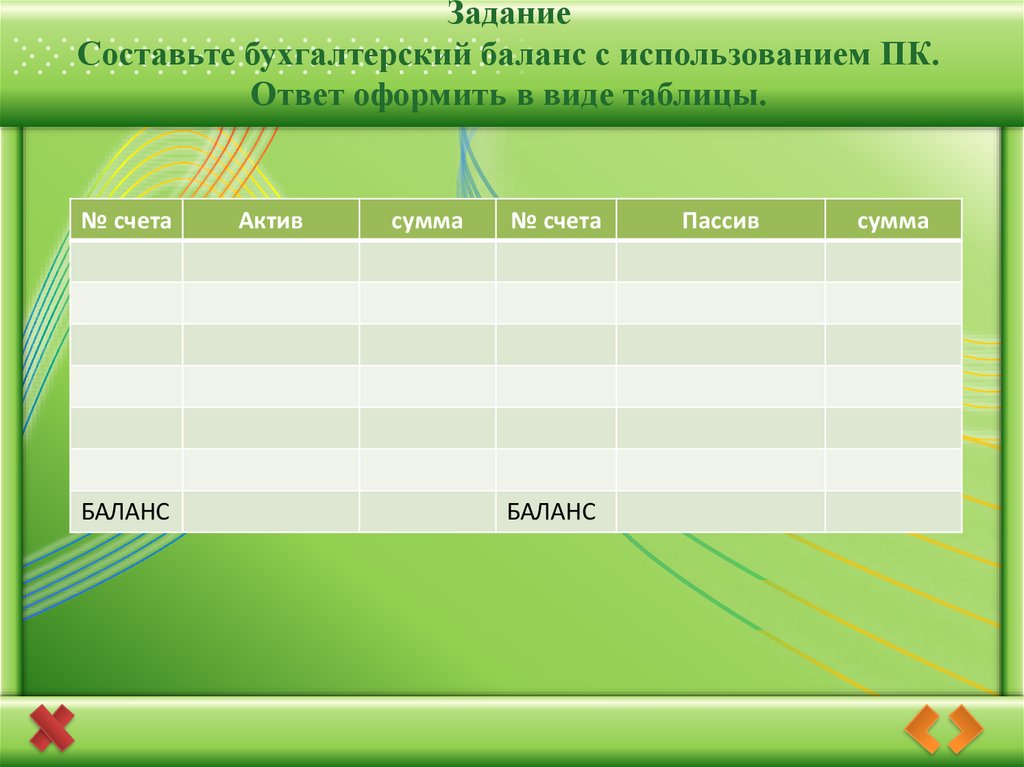 ЗаданиеСоставьте бухгалтерский баланс с использованием ПК.