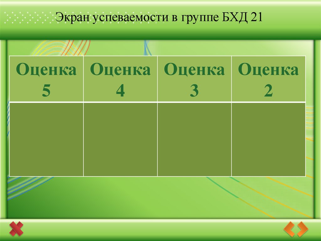 Экран успеваемости в группе БХД 21Оценка Оценка Оценка Оценка