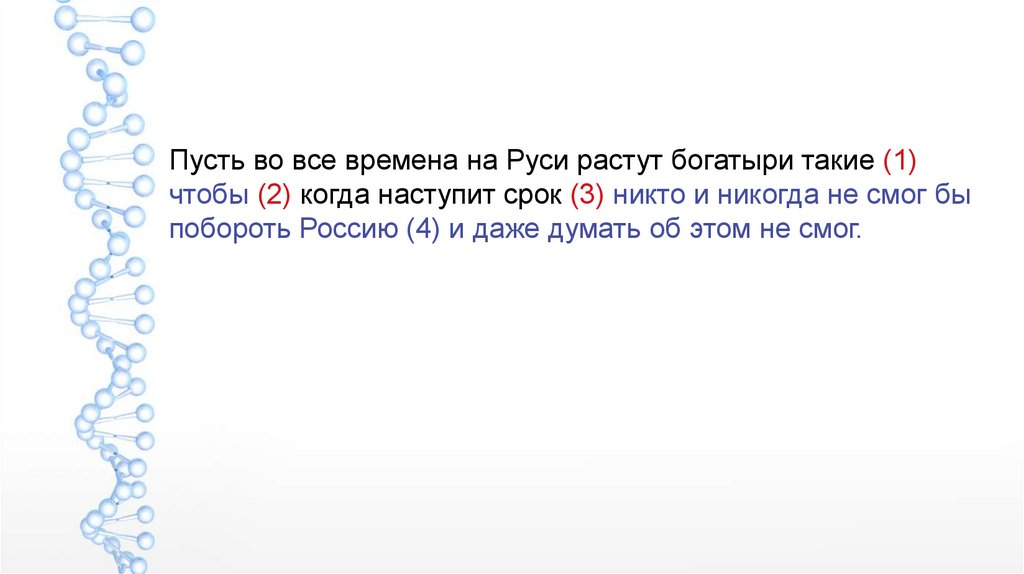 Пусть во все времена на Руси растут богатыри такие (1)чтобы (2) когда наступит срок (3) никто и никогда не смог бы