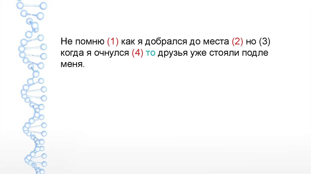 Не помню (1) как я добрался до места (2) но (3)когда я очнулся (4) то друзья уже стояли подле