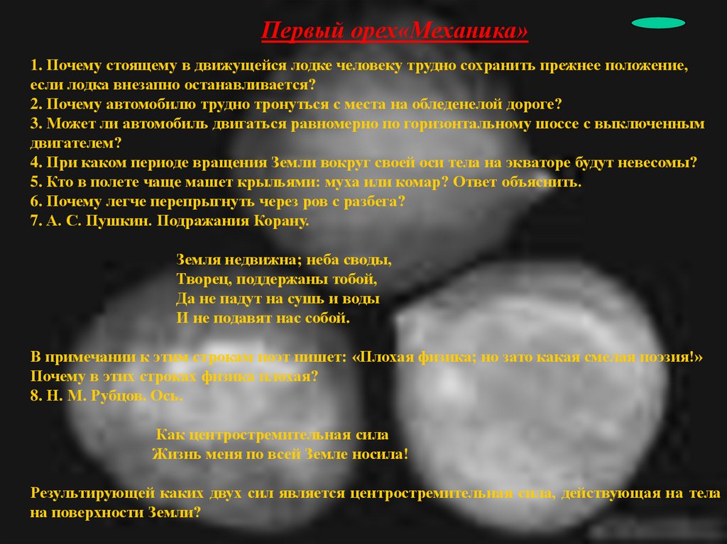 Первый орех«Механика»1. Почему стоящему в движущейся лодке человеку трудно сохранить прежнее положение,