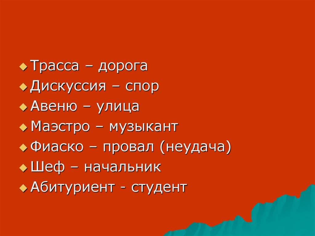 4. Трасса, дискуссия, авеню, маэстро, фиаско, шеф, абитуриент