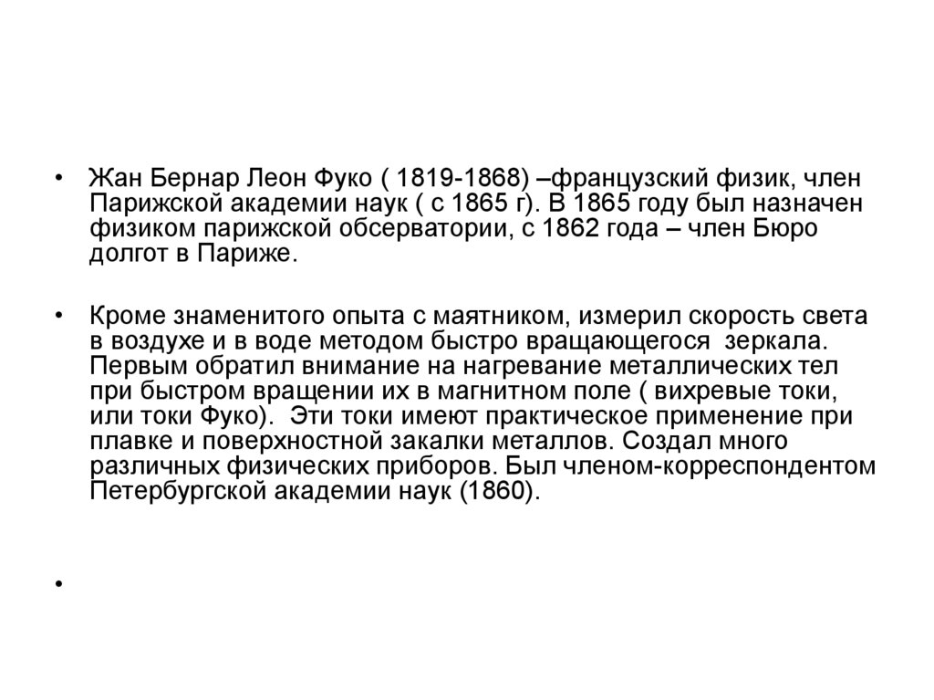 • Жан Бернар Леон Фуко ( 1819-1868) –французский физик, членПарижской академии наук ( с 1865 г). В 1865 году был назначен