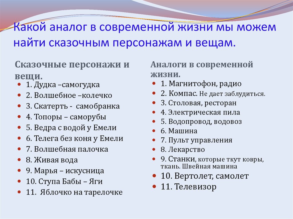 Какой аналог в современной жизни мы можемнайти сказочным персонажам и вещам.