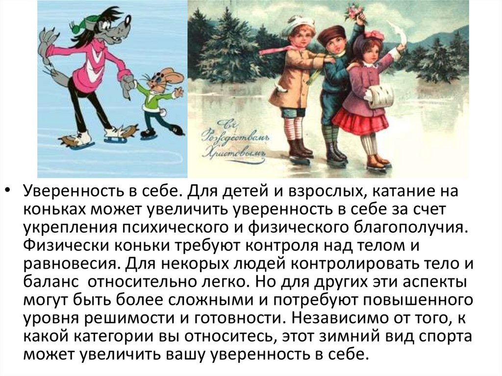 • Уверенность в себе. Для детей и взрослых, катание наконьках может увеличить уверенность в себе за счет