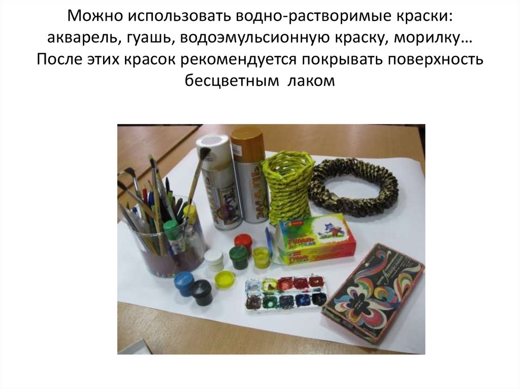 Можно использовать водно-растворимые краски:акварель, гуашь, водоэмульсионную краску, морилку…