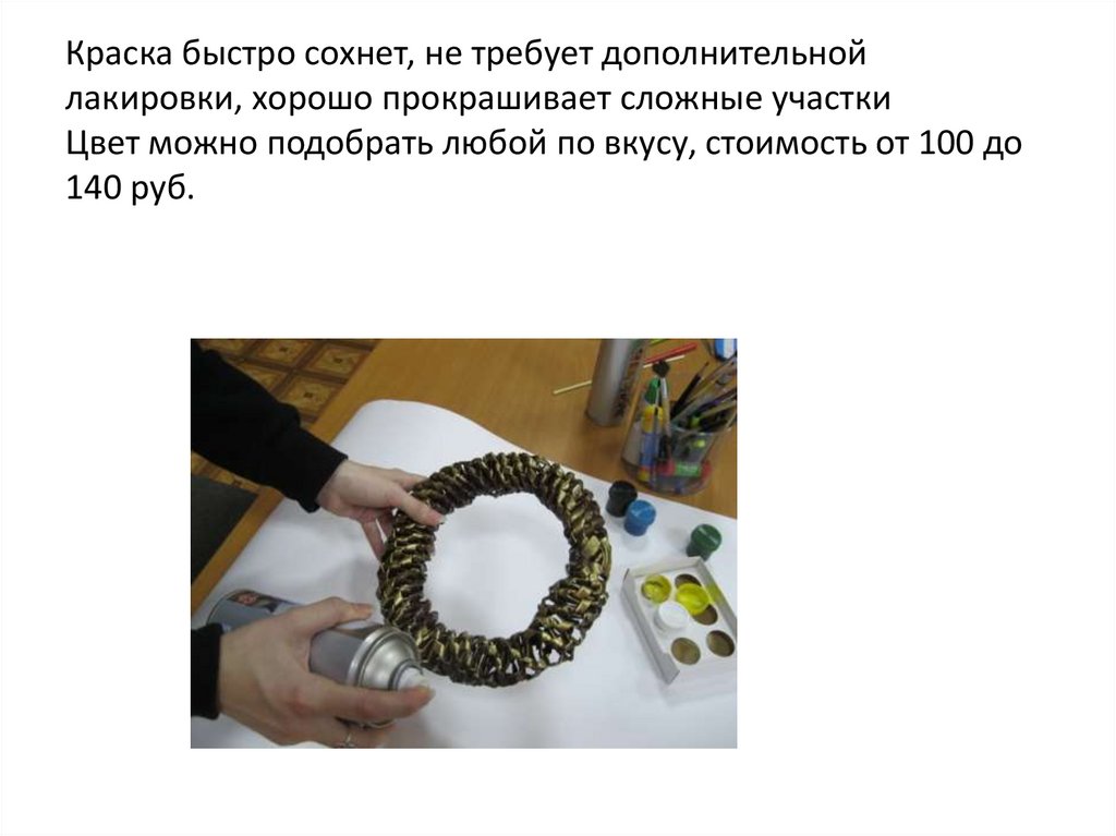 Краска быстро сохнет, не требует дополнительнойлакировки, хорошо прокрашивает сложные участки