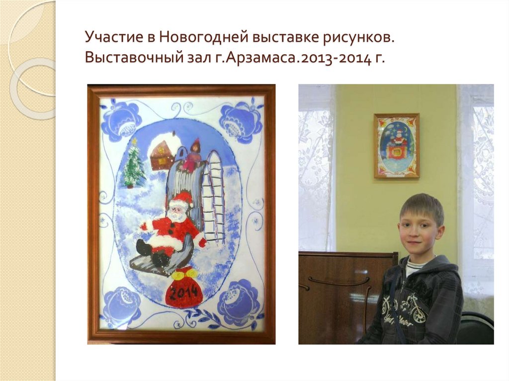 Участие в Новогодней выставке рисунков.Выставочный зал г.Арзамаса.2013-2014 г.