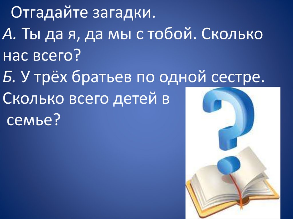 Отгадайте загадки.А. Ты да я, да мы с тобой. Сколько