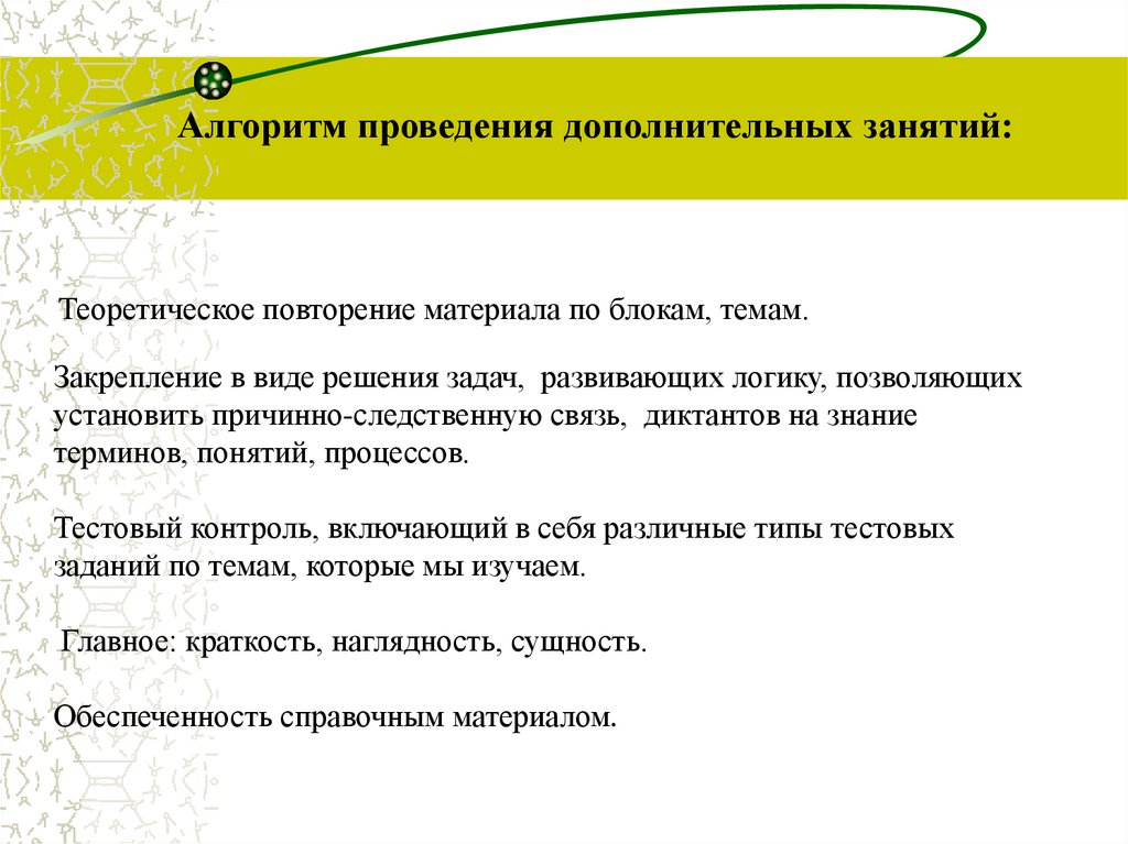 Алгоритм проведения дополнительных занятий:Теоретическое повторение материала по блокам, темам.