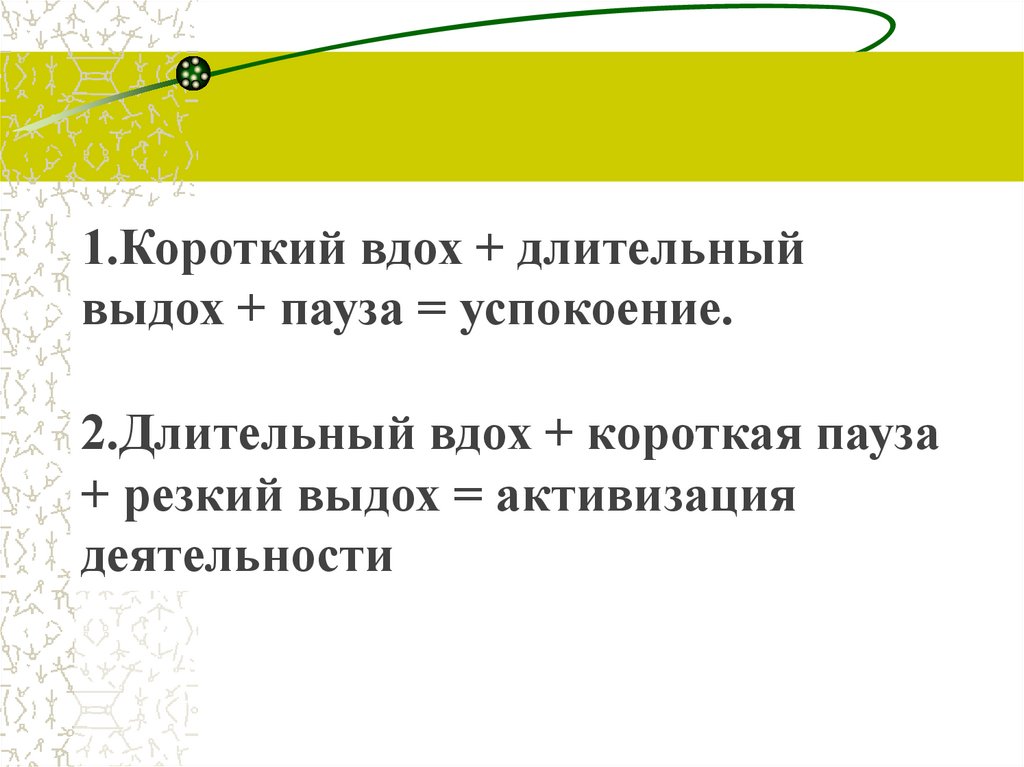 1.Короткий вдох + длительныйвыдох + пауза = успокоение.