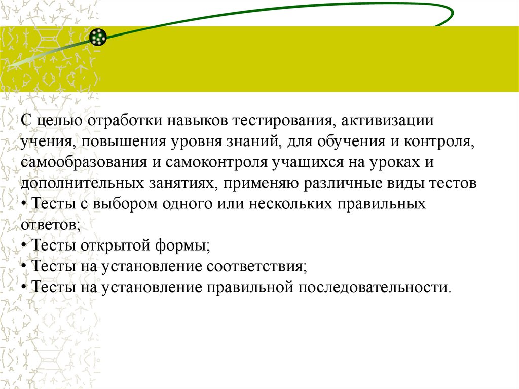 С целью отработки навыков тестирования, активизацииучения, повышения уровня знаний, для обучения и контроля,