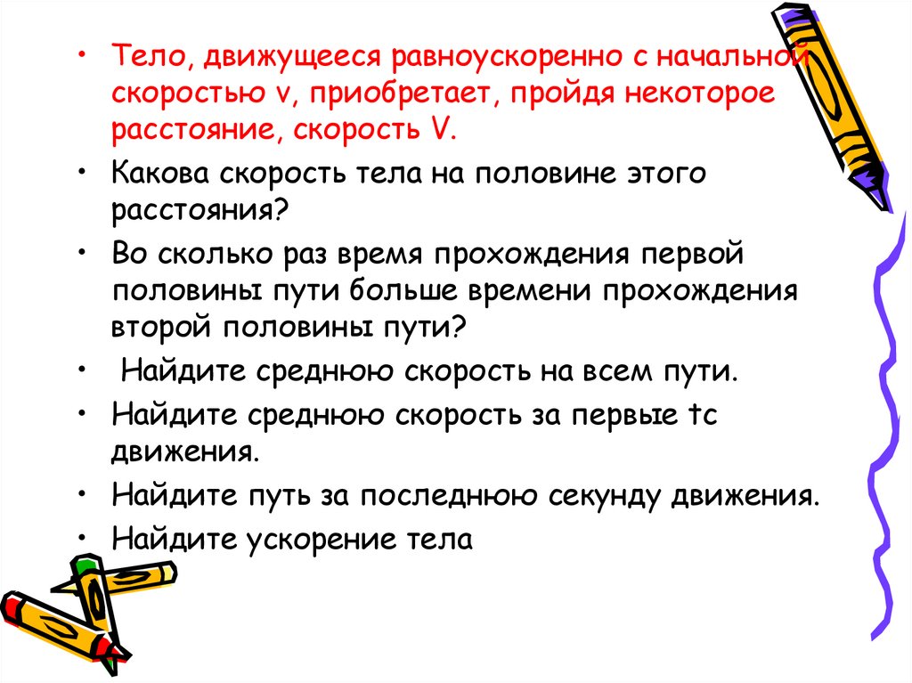 • Тело, движущееся равноускоренно с начальнойскоростью v, приобретает, пройдя некоторое