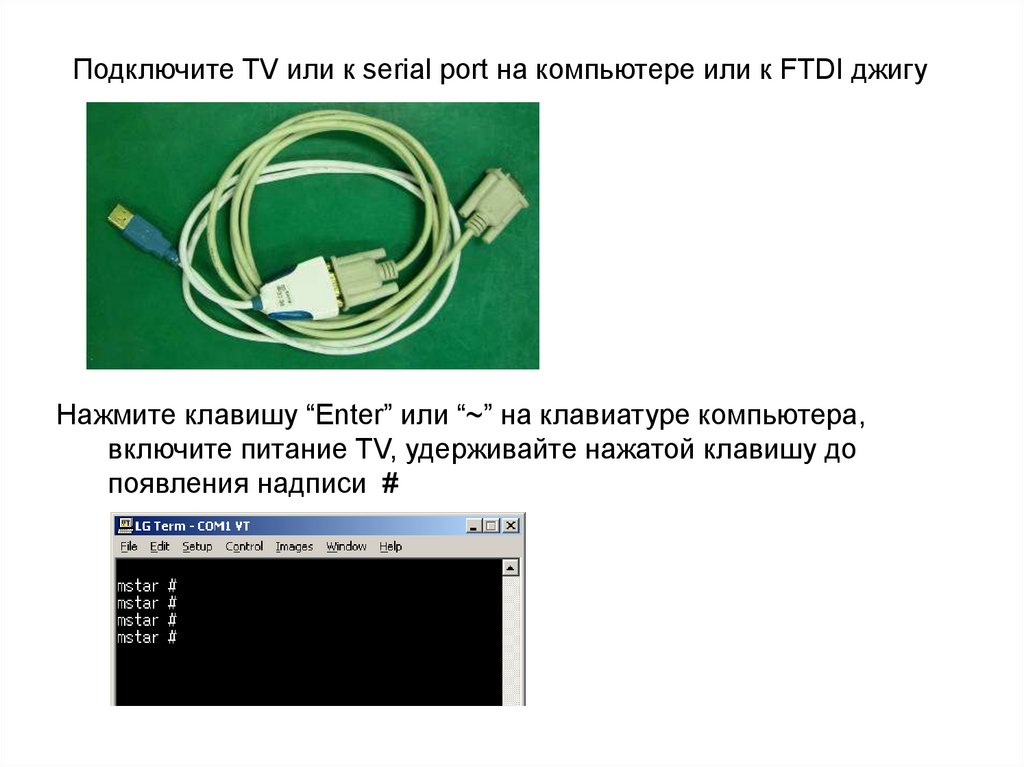 Подключите TV или к serial port на компьютере или к FTDI джигуНажмите клавишу “Enter” или “~” на клавиатуре компьютера,