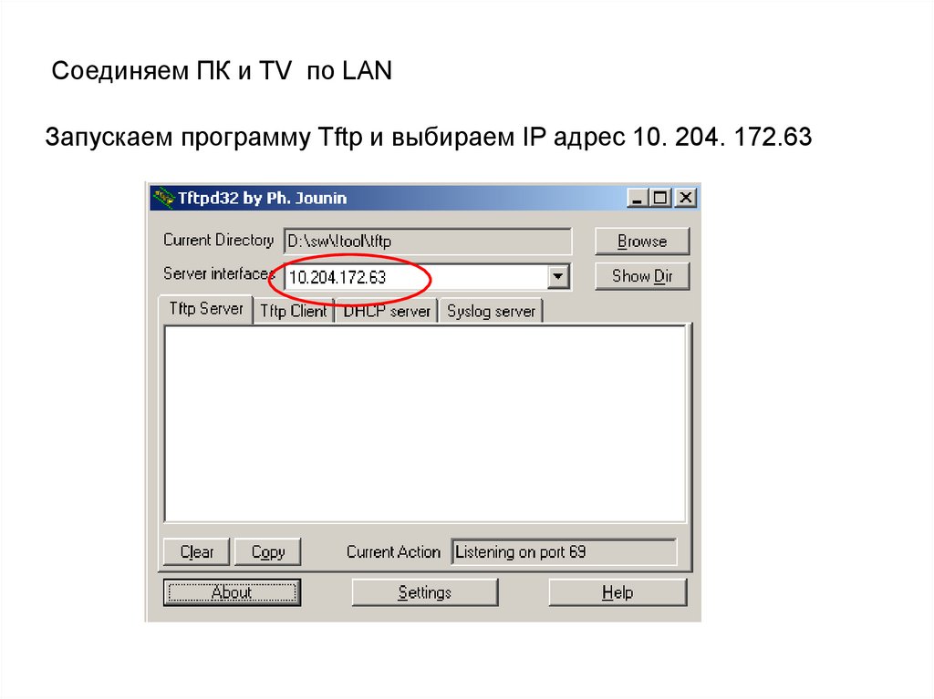 Соединяем ПК и TV по LANЗапускаем программу Tftp и выбираем IP адрес 10. 204. 172.63