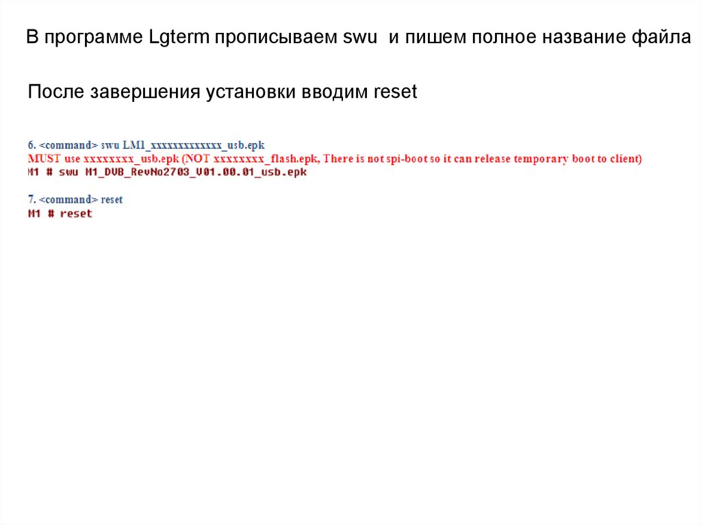 В программе Lgterm прописываем swu и пишем полное название файлаПосле завершения установки вводим reset