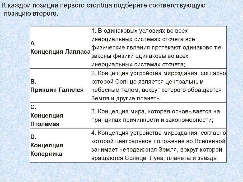 К каждой позиции первого столбца подберите соответствующуюпозицию второго.