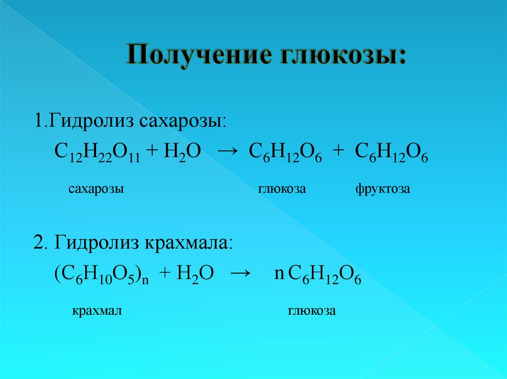 1.Гидролиз сахарозы:С12Н22О11 + Н2О → С6Н12О6 + С6Н12О6