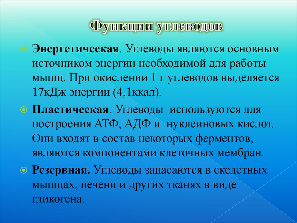 Энергетическая. Углеводы являются основнымисточником энергии необходимой для работы