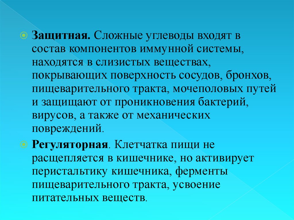 Защитная. Сложные углеводы входят всостав компонентов иммунной системы,