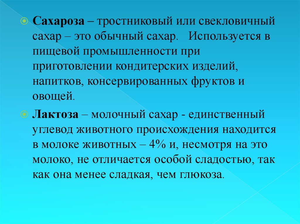 Сахароза – тростниковый или свекловичныйсахар – это обычный сахар. Используется в