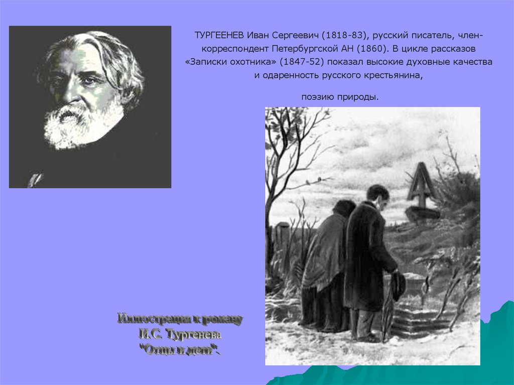 ТУРГЕЕНЕВ Иван Сергеевич (1818-83), русский писатель, членкорреспондент Петербургской АН (1860). В цикле рассказов«Записки охотника» (1847-52) показал высокие духовные качества