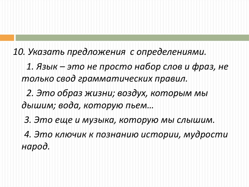 10. Указать предложения с определениями.1. Язык – это не просто набор слов и фраз, не