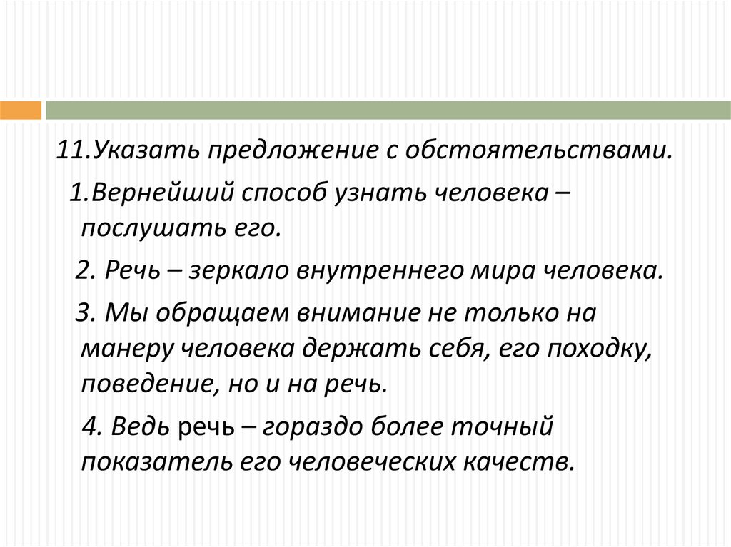 11.Указать предложение с обстоятельствами.1.Вернейший способ узнать человека –