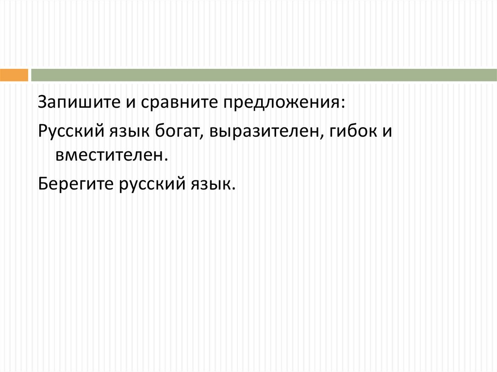 Запишите и сравните предложения:Русский язык богат, выразителен, гибок и