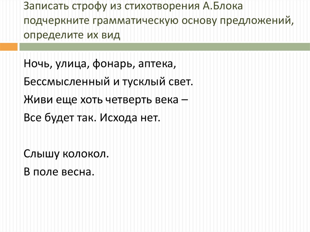 Записать строфу из стихотворения А.Блокаподчеркните грамматическую основу предложений,