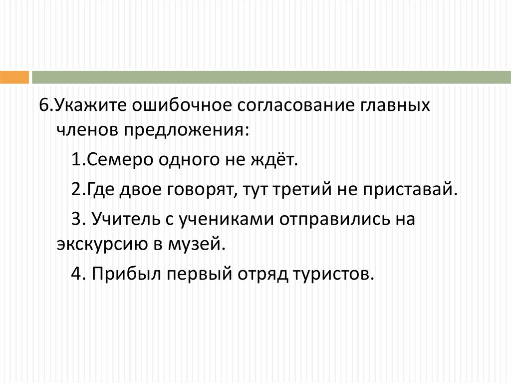 6.Укажите ошибочное согласование главныхчленов предложения: