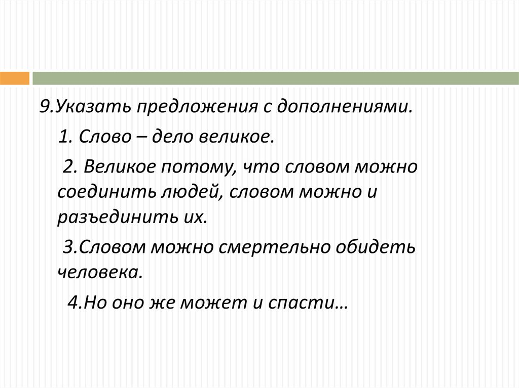 9.Указать предложения с дополнениями.1. Слово – дело великое.