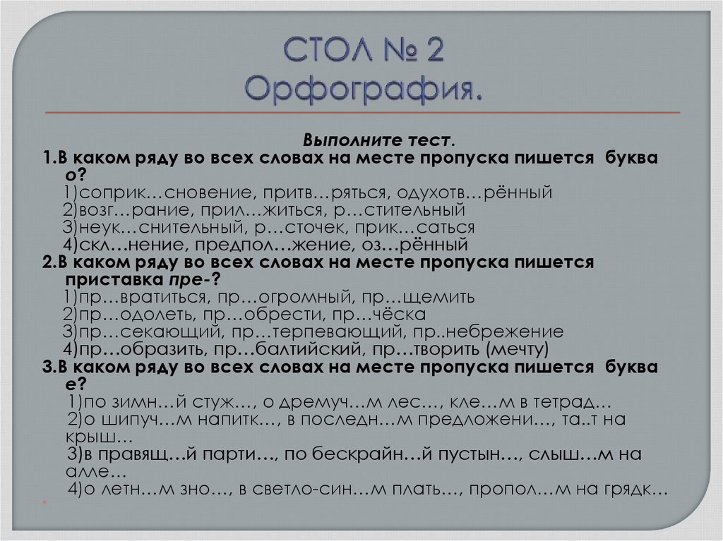 Выполните тест.1.В каком ряду во всех словах на месте пропуска пишется буква