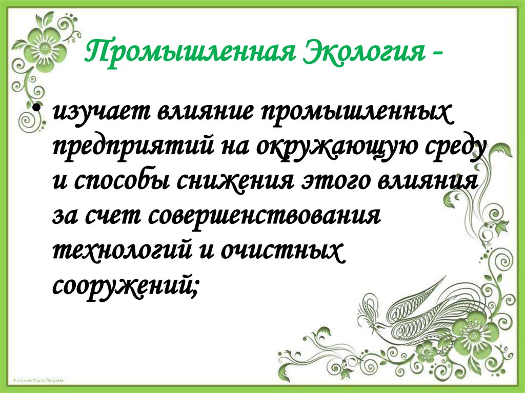 Промышленная Экология • изучает влияние промышленныхпредприятий на окружающую среду