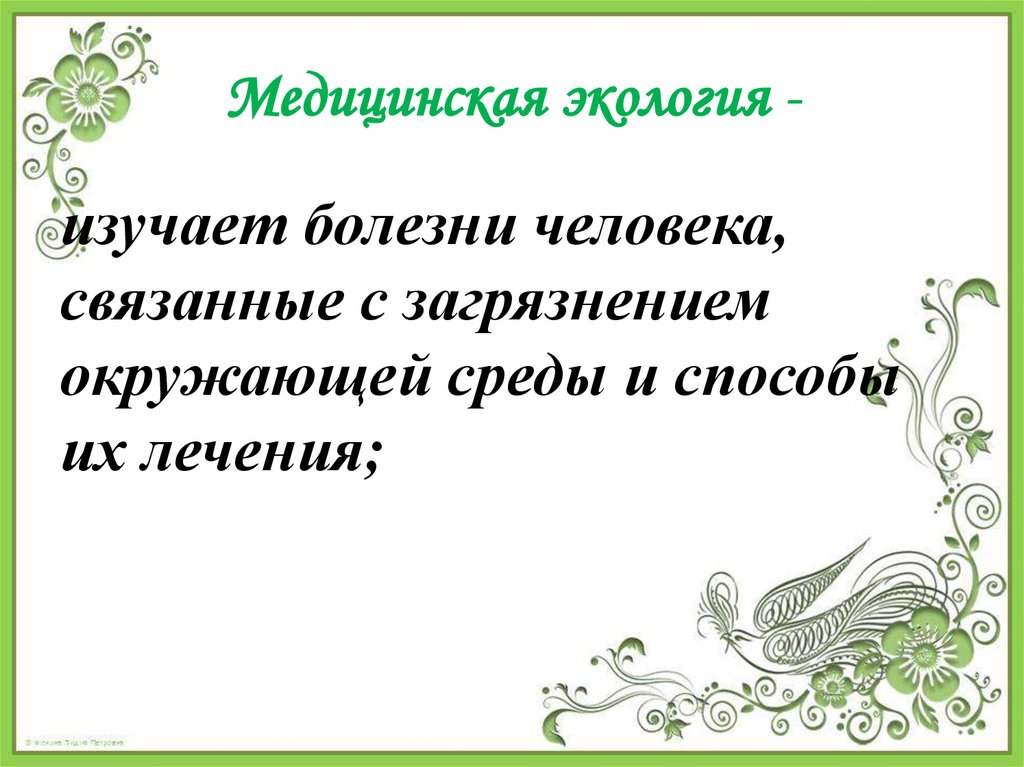 Медицинская экология изучает болезни человека,связанные с загрязнением