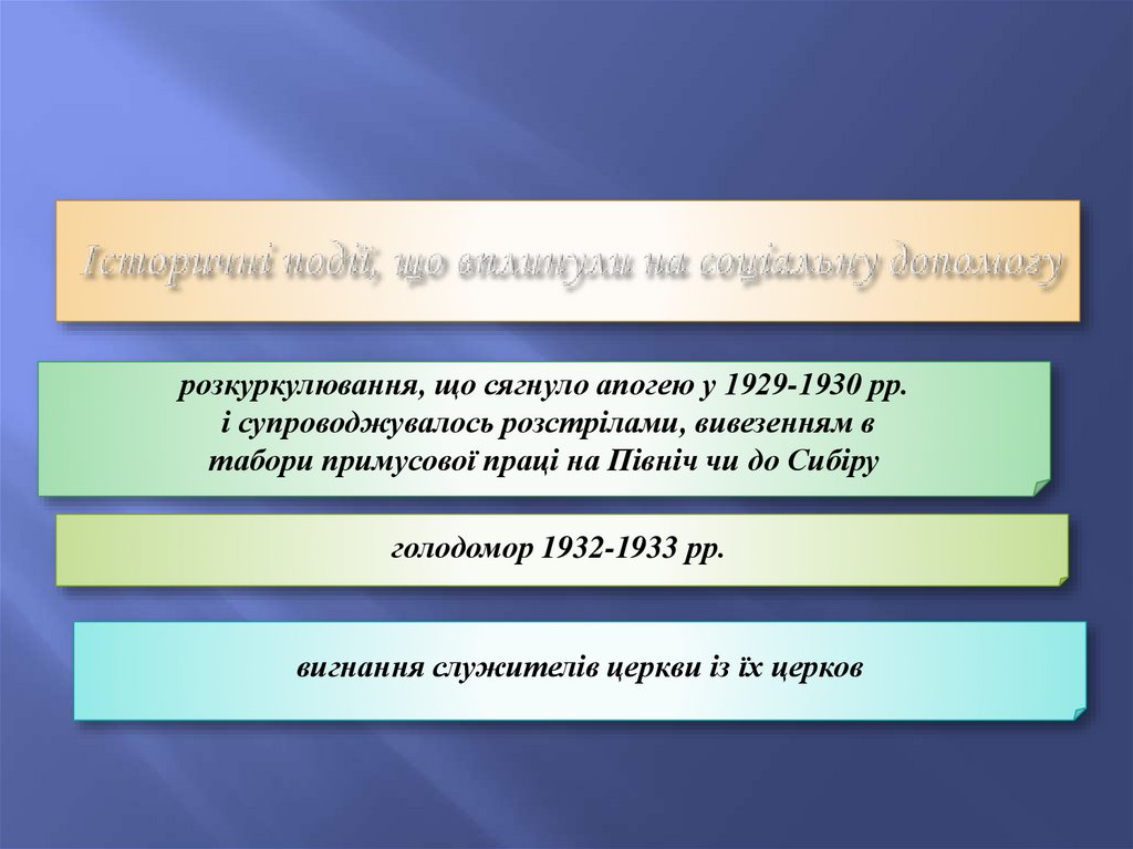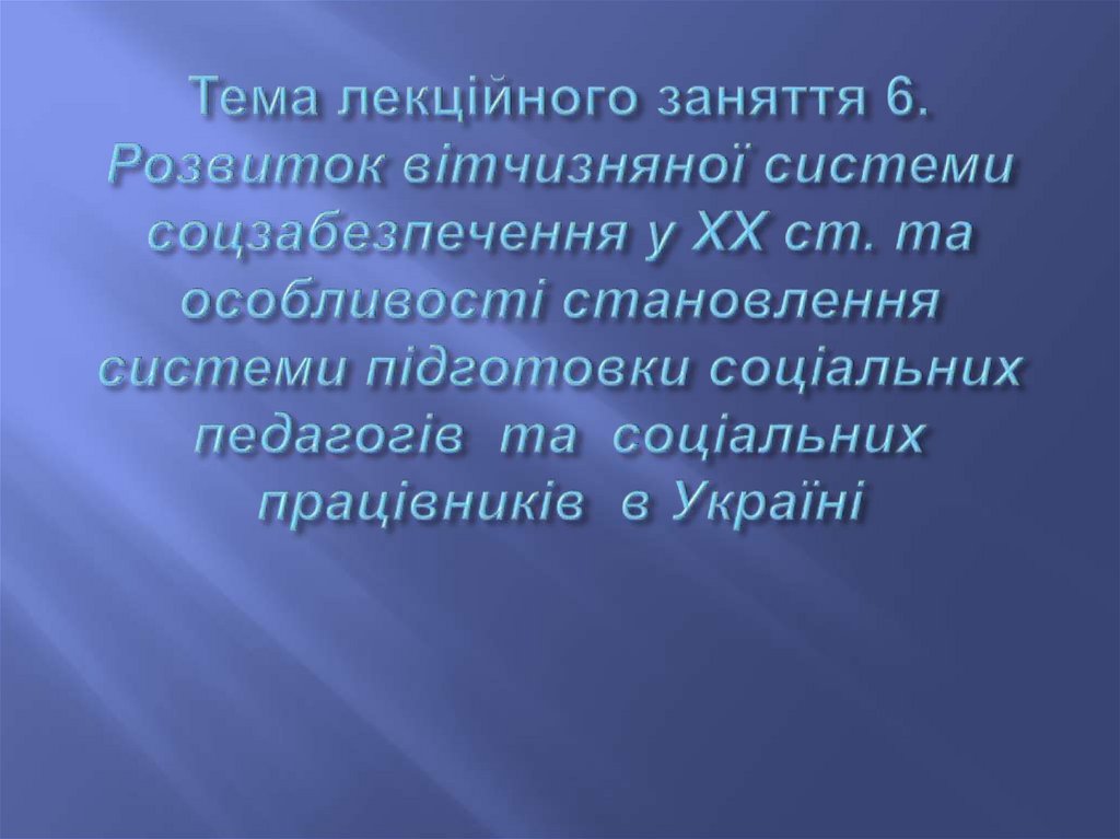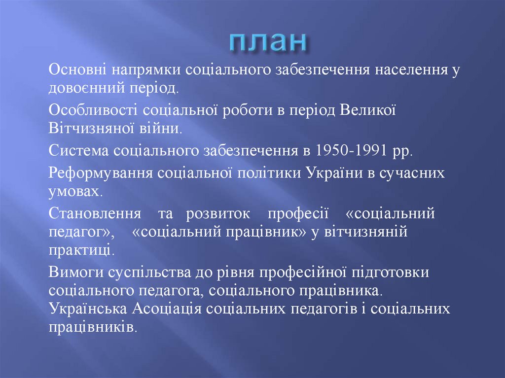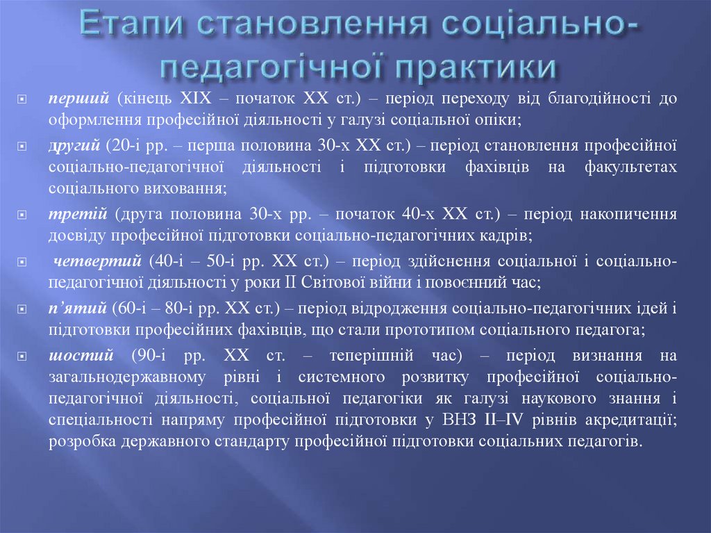 перший (кінець XIX – початок XX ст.) – період переходу від благодійності дооформлення професійної діяльності у галузі соціальної опіки;