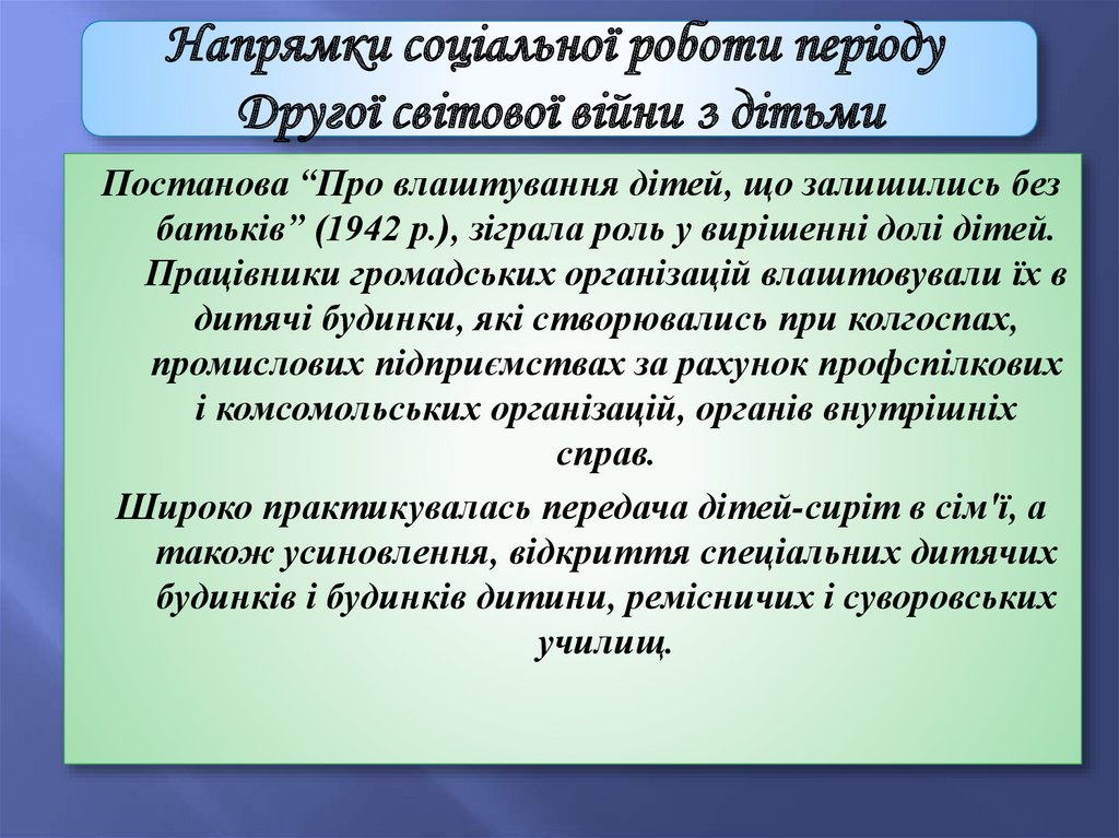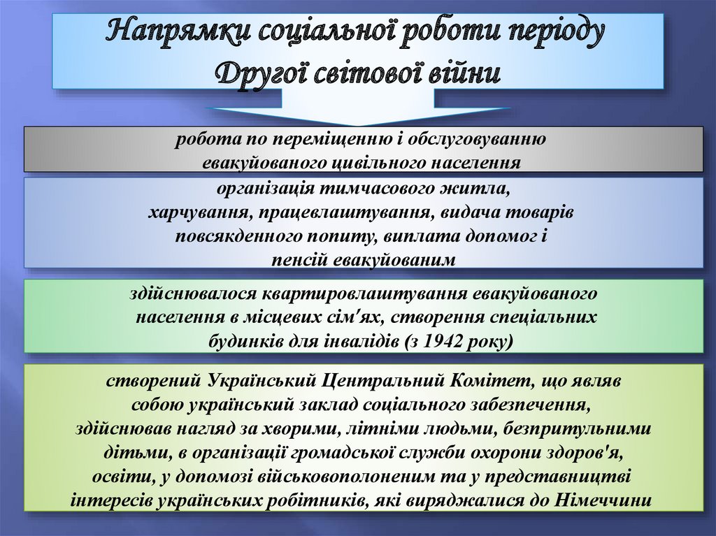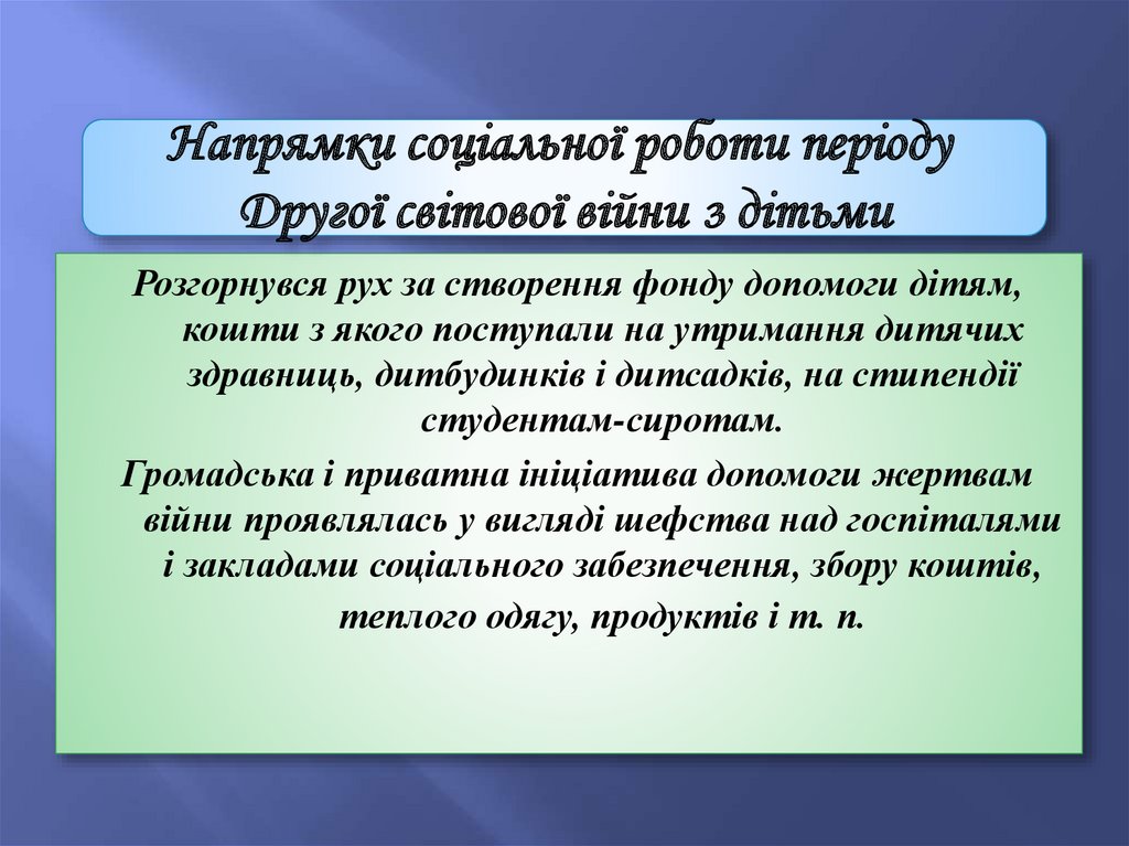 четвертий (40-і – 50-і рр. XX ст.) – період здійснення соціальної і соціальнопедагогічної діяльності у роки ІІ Світової війни і повоєнний час;