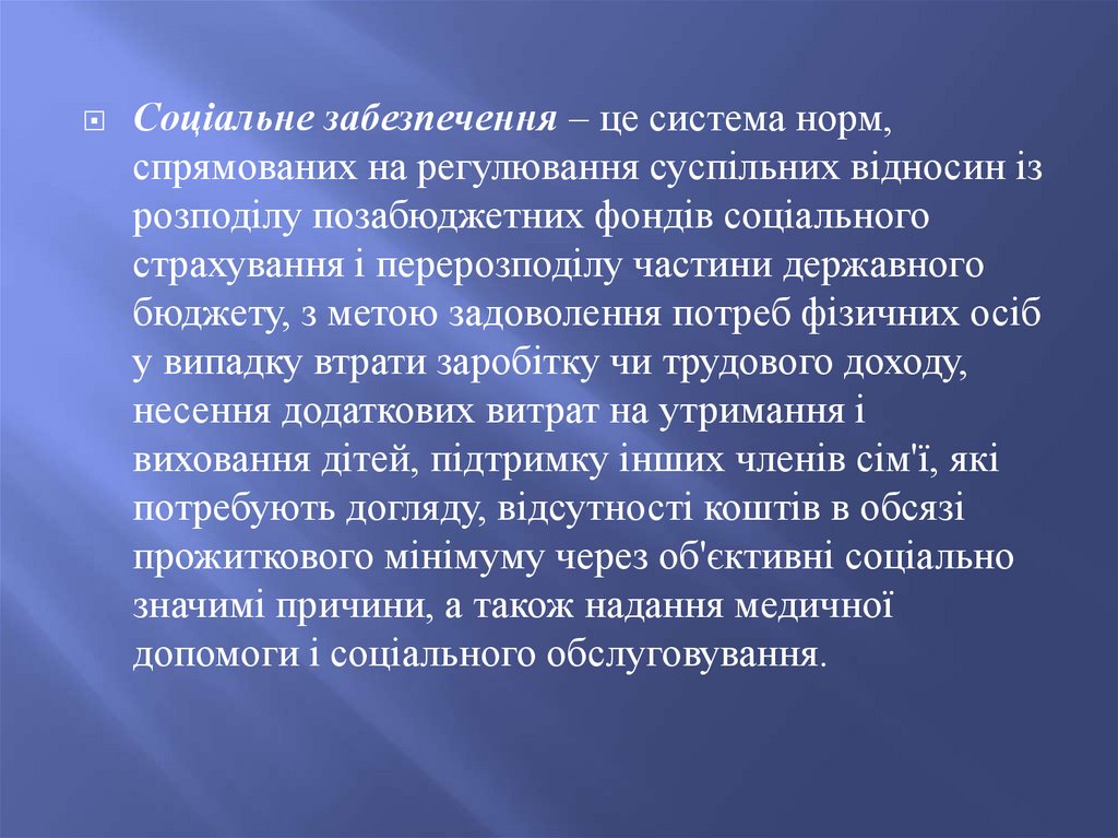 Соціальне забезпечення – це система норм,спрямованих на регулювання суспільних відносин із