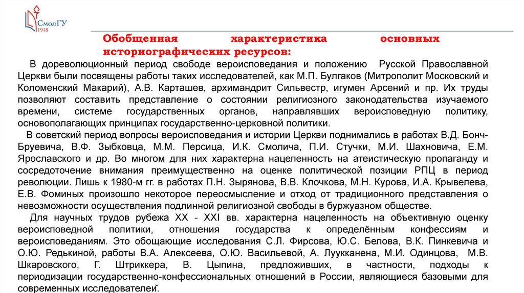 Коломенский Макарий), А.В. Карташев, архимандрит Сильвестр, игумен Арсений и пр. Их труды