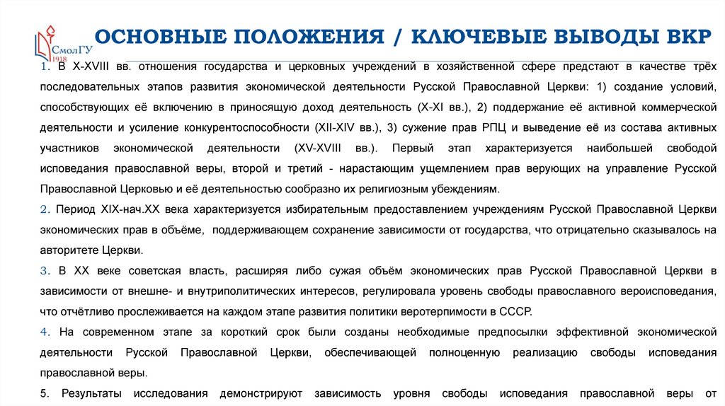 ОСНОВНЫЕ ПОЛОЖЕНИЯ / КЛЮЧЕВЫЕ ВЫВОДЫ ВКР1. В X-XVIII вв. отношения государства и церковных учреждений в хозяйственной сфере предстают в качестве трёх