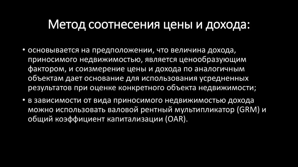 Метод соотнесения цены и дохода:• основывается на предположении, что величина дохода,