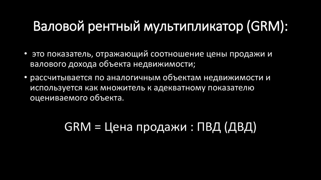 Валовой рентный мультипликатор (GRM):• это показатель, отражающий соотношение цены продажи и