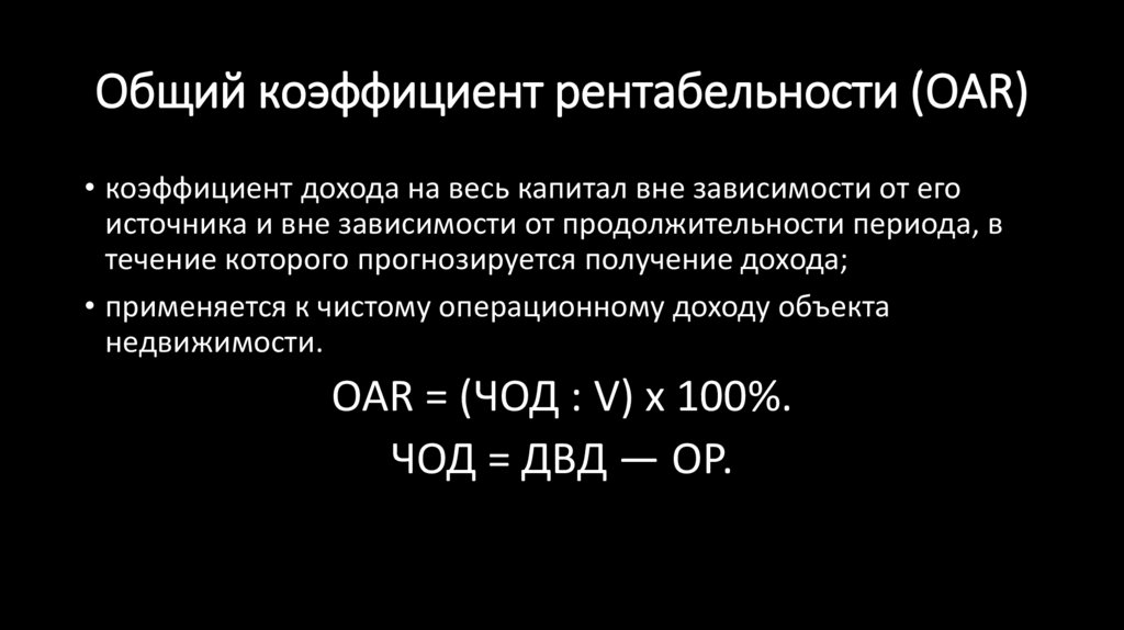 Общий коэффициент рентабельности (OAR)• коэффициент дохода на весь капитал вне зависимости от его