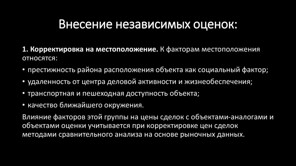 Внесение независимых оценок:1. Корректировка на местоположение. К факторам местоположения
