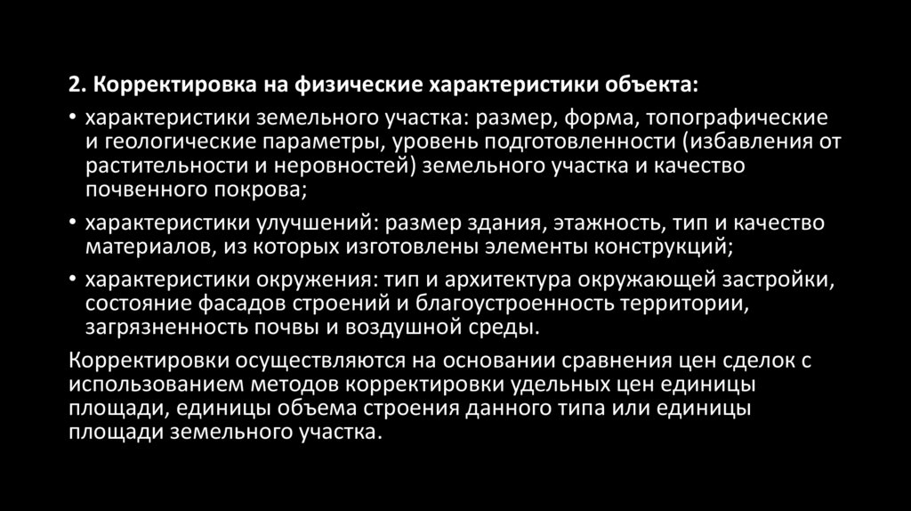 2. Корректировка на физические характеристики объекта:• характеристики земельного участка: размер, форма, топографические