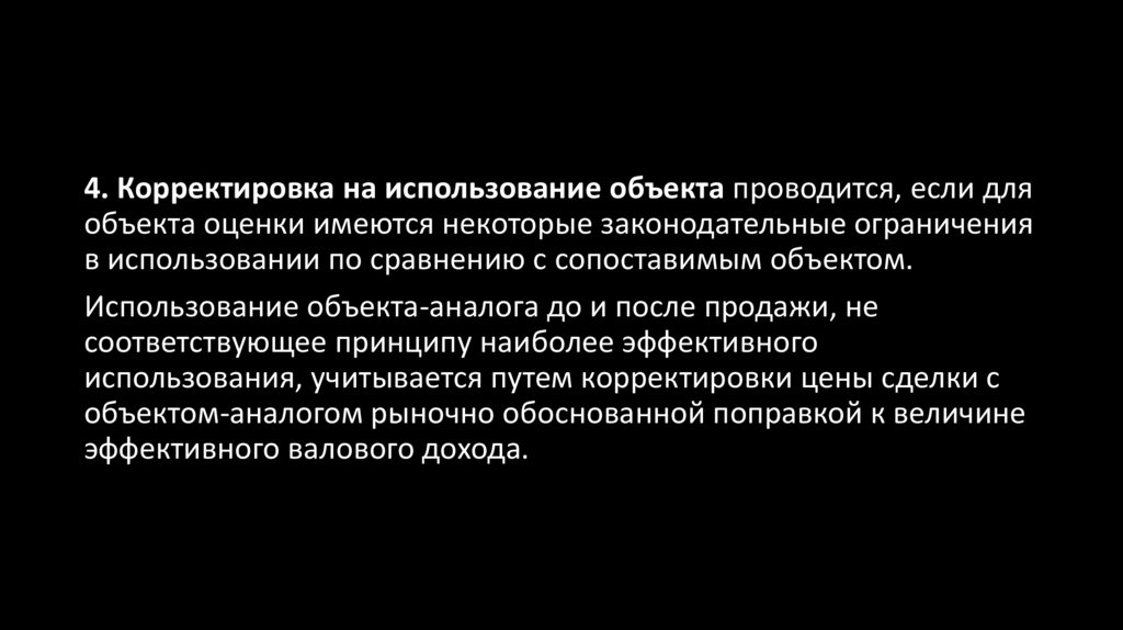 4. Корректировка на использование объекта проводится, если дляобъекта оценки имеются некоторые законодательные ограничения