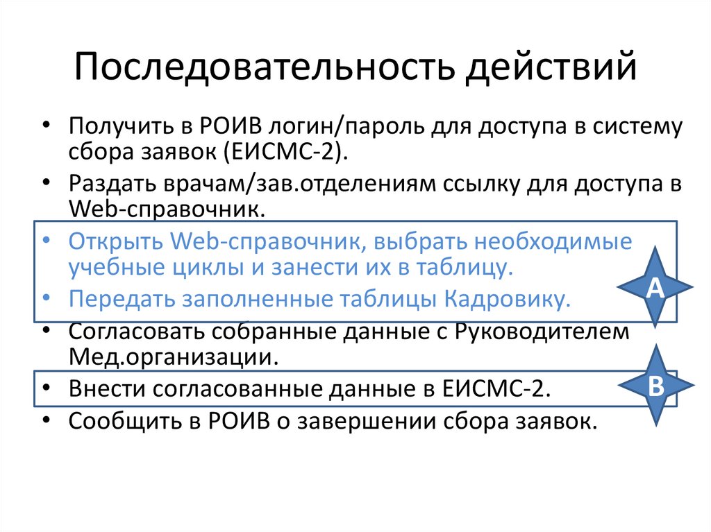 Последовательность действий• Получить в РОИВ логин/пароль для доступа в систему