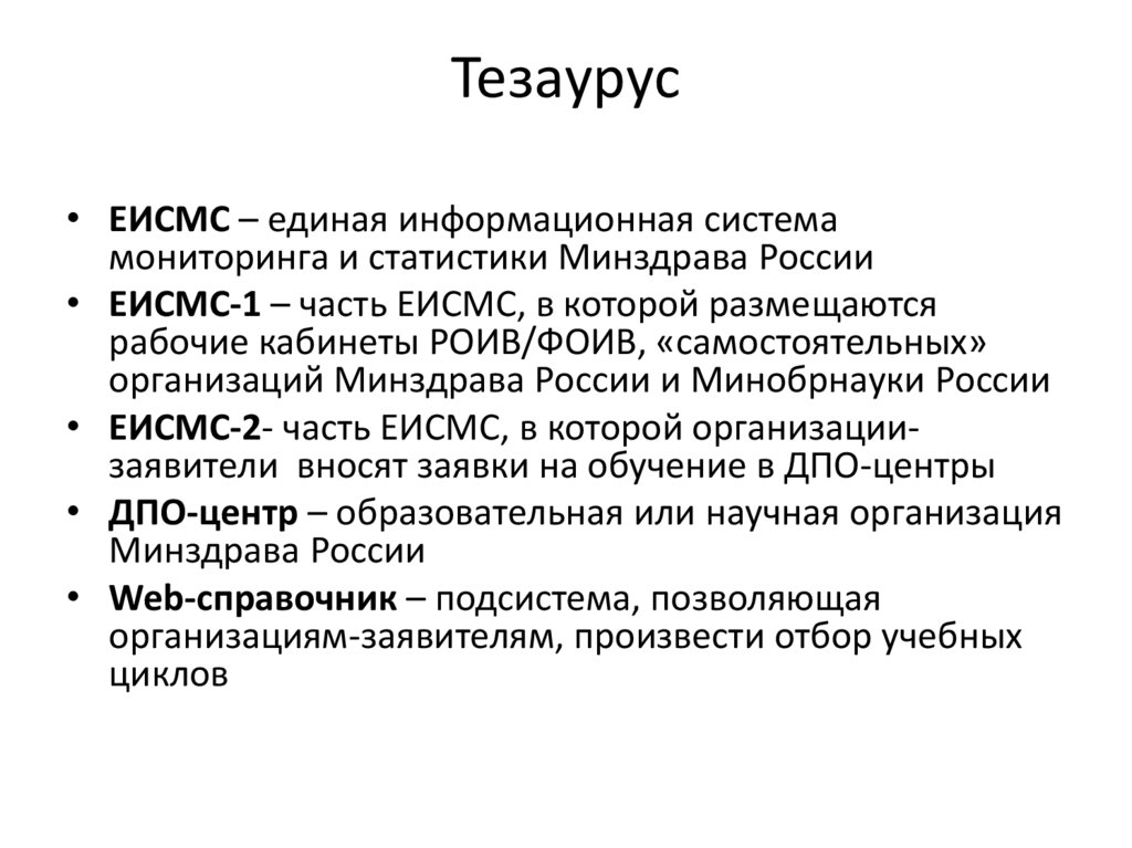 Тезаурус• ЕИСМС – единая информационная система